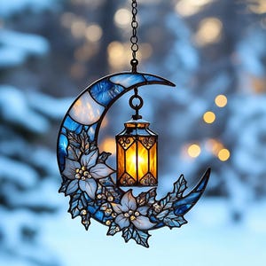 Crescent Moon Faux Stained Glass Ornament – Blue Lantern Acrylic Christmas Tree Suncatcher Gift